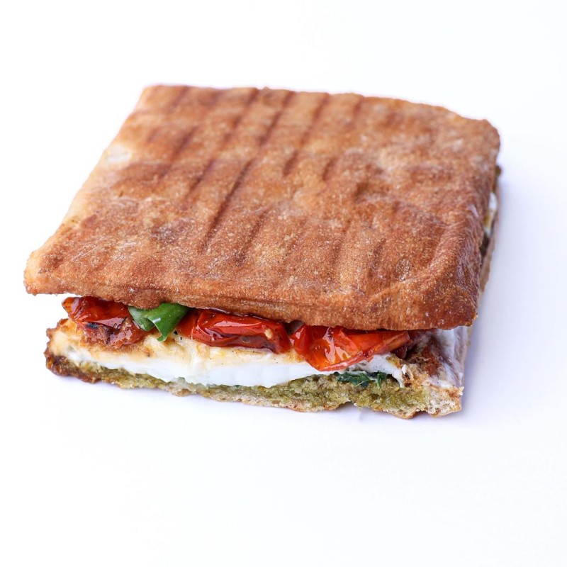 خبز شباتا محشو ببوراتا طازجة، بيستو ، وطماطم شيري مشوية بنكهة متوازنة وغنية.